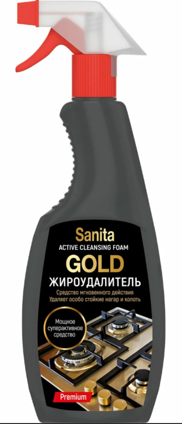 Спрей Жироудалитель Sanita Gold - супермощное средство мгновенного действия для удаления особо сложных жировых загрязнений. Формула с увеличенной концентрацией действующего вещества растворяет стойкие жировые загрязнения, нагар, въевшуюся грязь, очищает без усилий. Результат всего за 20 секунд!