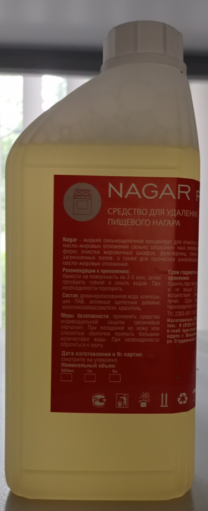 • Средство для удаления пищевого нагара Nagar - жидкий сильнощелочной концентрат для очистки поверхностей от нагара, сажи и масло-жировых отложений с сильно загрязненного оборудования: коптильных камер, термокамер, дымогенераторов, котлов для варки, пекарных форм; очистки жаровочных шкафов, фритюрниц, грилей и т.д., сильно загрязненных полов в цехах, а так же для прочистки канализационных стоков от масло-жировых отложений на предприятиях пищевой и перерабатывающей промышленности, общественного питания и в быту