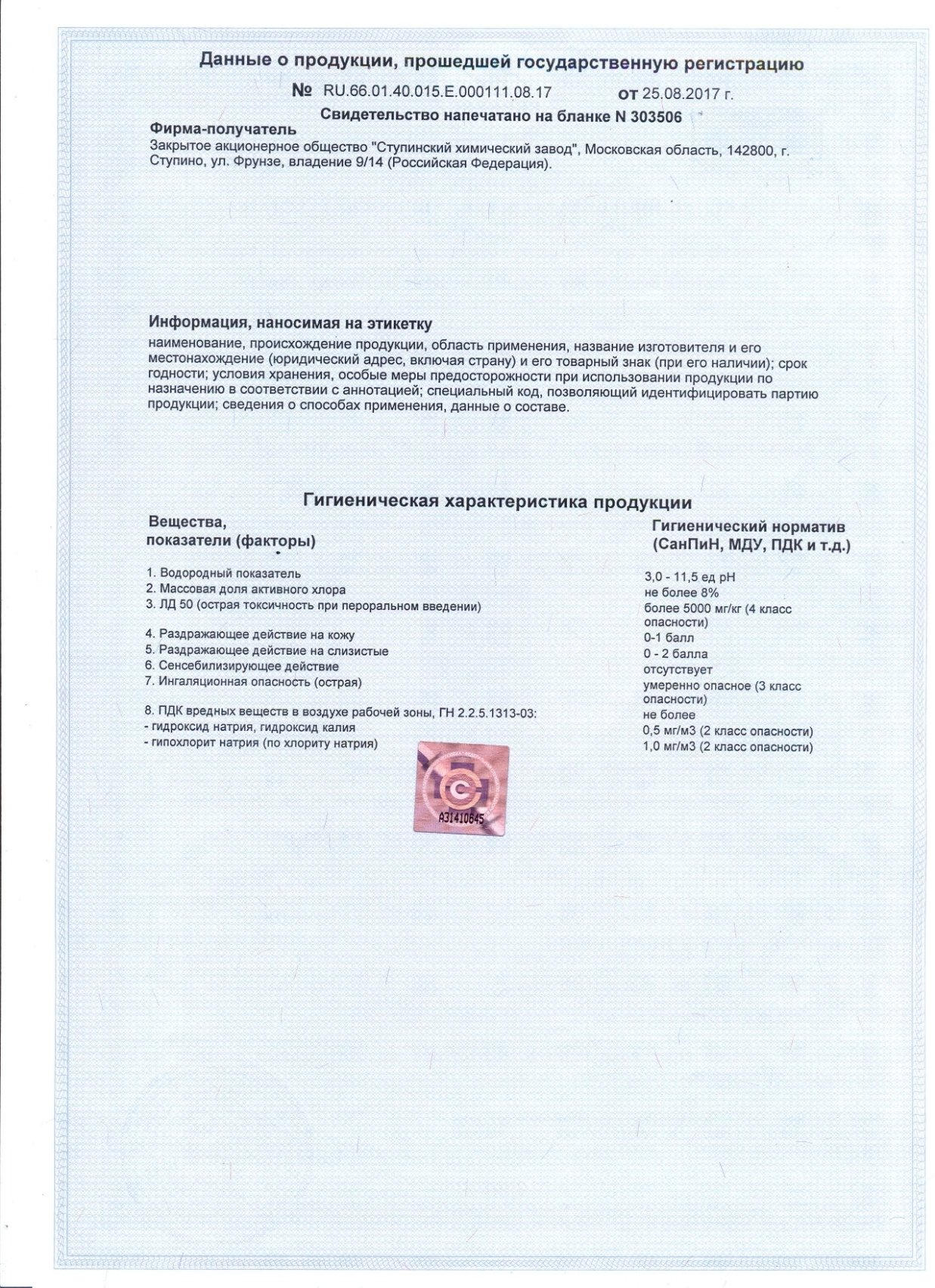 Состав: ≥ 5%, но < 15% гипохлорит натрия; < 5%: АПАВ или мыло на основе натуральных жирных кислот, НПАВ, щелочь, ароматизатор.