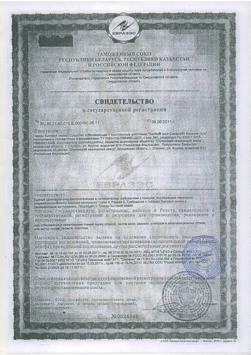 • SANFOR "Белизна" гель 3 в 1 - специальное густое средство с инновационной формулой отбеливания и удаления пятен. Благодаря комплексному действию «3 в 1» - незаменимо при стирке, а также для дезинфекции и чистки сантехники и труб.