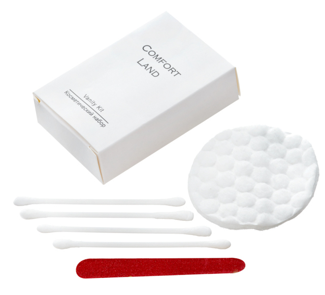Косметический набор в картоне с черной (4 ватных палочки, 2 ватных диска,пилочка) Comfort Land 1/500