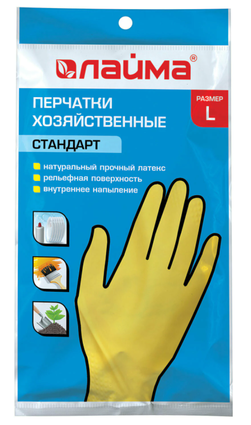 Хозяйственные латексные перчатки LAIMA "Стандарт" защищают руки от воздействия грязи, влаги, моющих и чистящих средств при любых бытовых и хозяйственных работах: мытьё посуды, стирка белья, уборка, садоводческая работа и т.д. Они изготовлены из прочного латексного материала, что гарантирует защиту рук от механических внешних повреждений. Классический размер L подойдет на руку стандартного размера. В комплекте - 1 пара. Внутреннее хлопчатобумажное напыление обеспечивает гипоаллергенность и гигроскопичность. Рельефная поверхность препятствует скольжению предметов