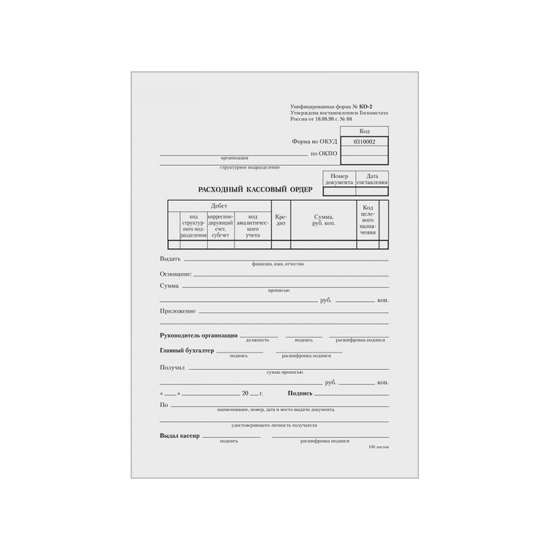 Бланк "Расходный кассовый ордер", А5 склейка 100 шт