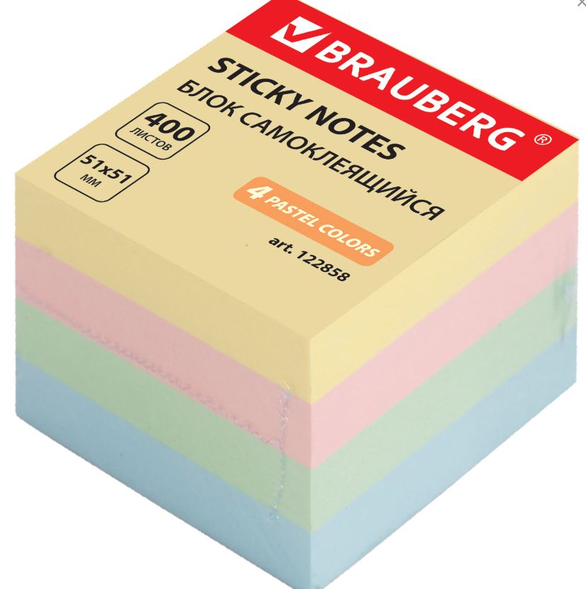 Блок самоклеящийся (стикеры), BRAUBERG, ПАСТЕЛЬНЫЙ, 51х51 мм, 400 листов, 4 цвета, 122858