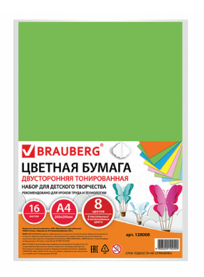 • Немелованная двусторонняя цветная бумага окрашивается непосредственно в процессе изготовления и обладает плотностью 80 г/м2. Набор включает 16 листов формата А4 (210х297 мм) в 8-ми цветах (4 пастельных + 4 интенсивных).
