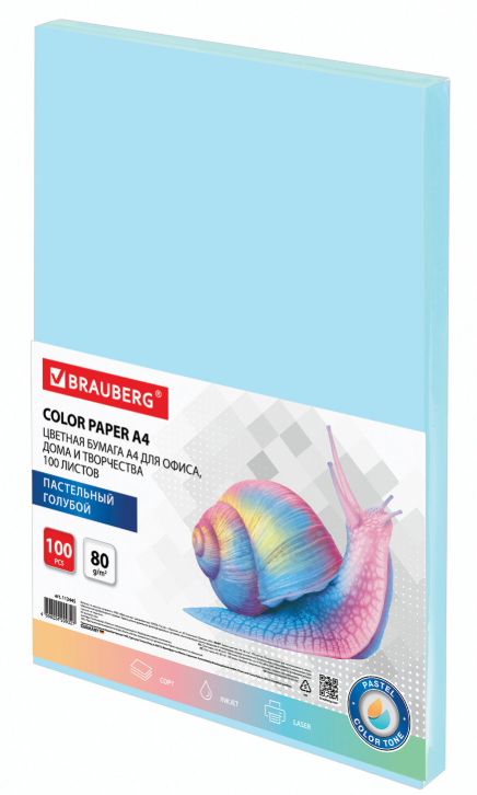 Бумага цветная BRAUBERG А4 80 г/м2 100 л. пастель голубая для офисной техники