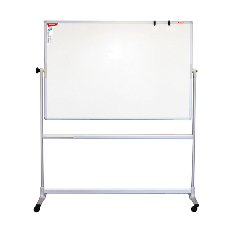 Магнитно-маркерная доска размера 90*120 см в алюминиевой рамке на мобильной подставке позволяет представить аудитории значительно большее количество данных, чем стандартные модели, закрепляемые на стене. Информация может наноситься на обе стороны доски, которая за счет крепление к раме вращается в горизонтальной плоскости на 360 градусов. Может фиксироваться в любом положении. Снабжена лотком для аксессуаров и тормозной системой для предотвращения случайного движения.