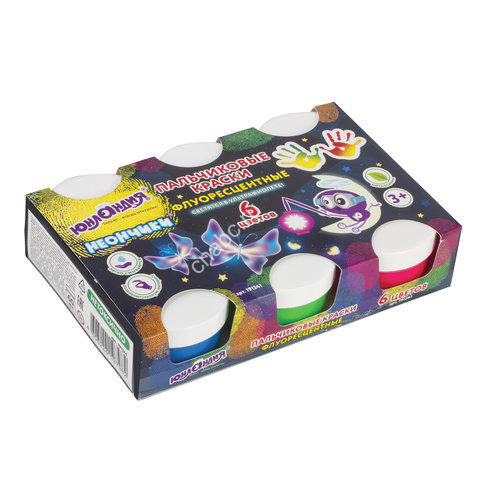 Краски пальчиковые флуоресцентные ЮНЛАНДИЯ "НЕОНЧИКИ" 6 цветов по 60 мл в баночках
