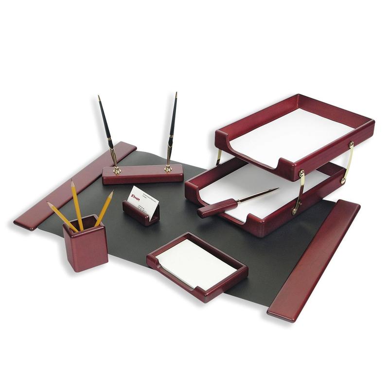 • Набор выполнен из красного темного дерева. Комплектация 7 предметов: двойной лоток для бумаг (друг на друга ставить не рекомендуется), бокс для бумаги, нож для вскрытия писем, подставка с шариковыми ручками