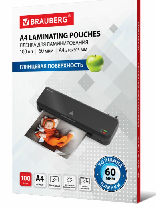 Пленки-заготовки для ламинирования А4, КОМПЛЕКТ 100 шт. 60 мкм BRAUBERG