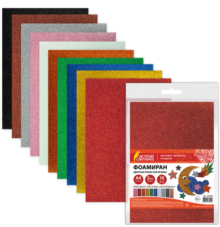 Пористая резина/фоамиран А4 2 мм, 10 листов, 10 цветов с блесками