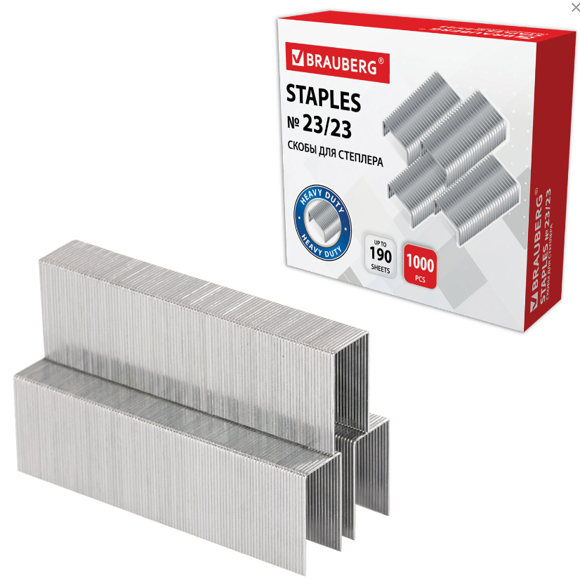 • Заточенные сверхпрочные стальные скобы серебристого цвета для степлера BRAUBERG размером № 23/23.
