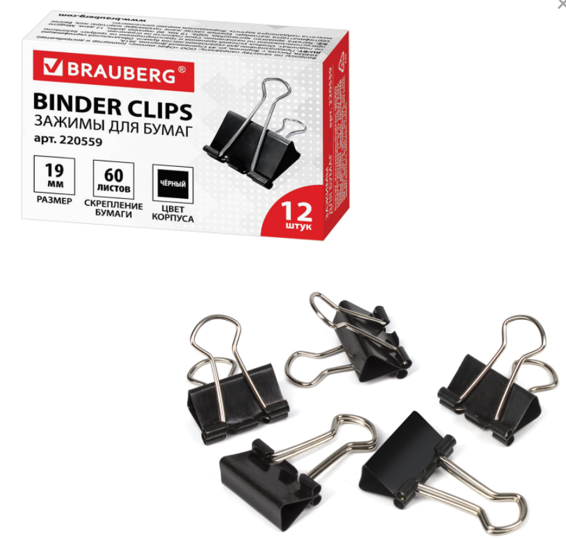 Зажимы для бумаг 19 мм 12шт черные на 60 листов