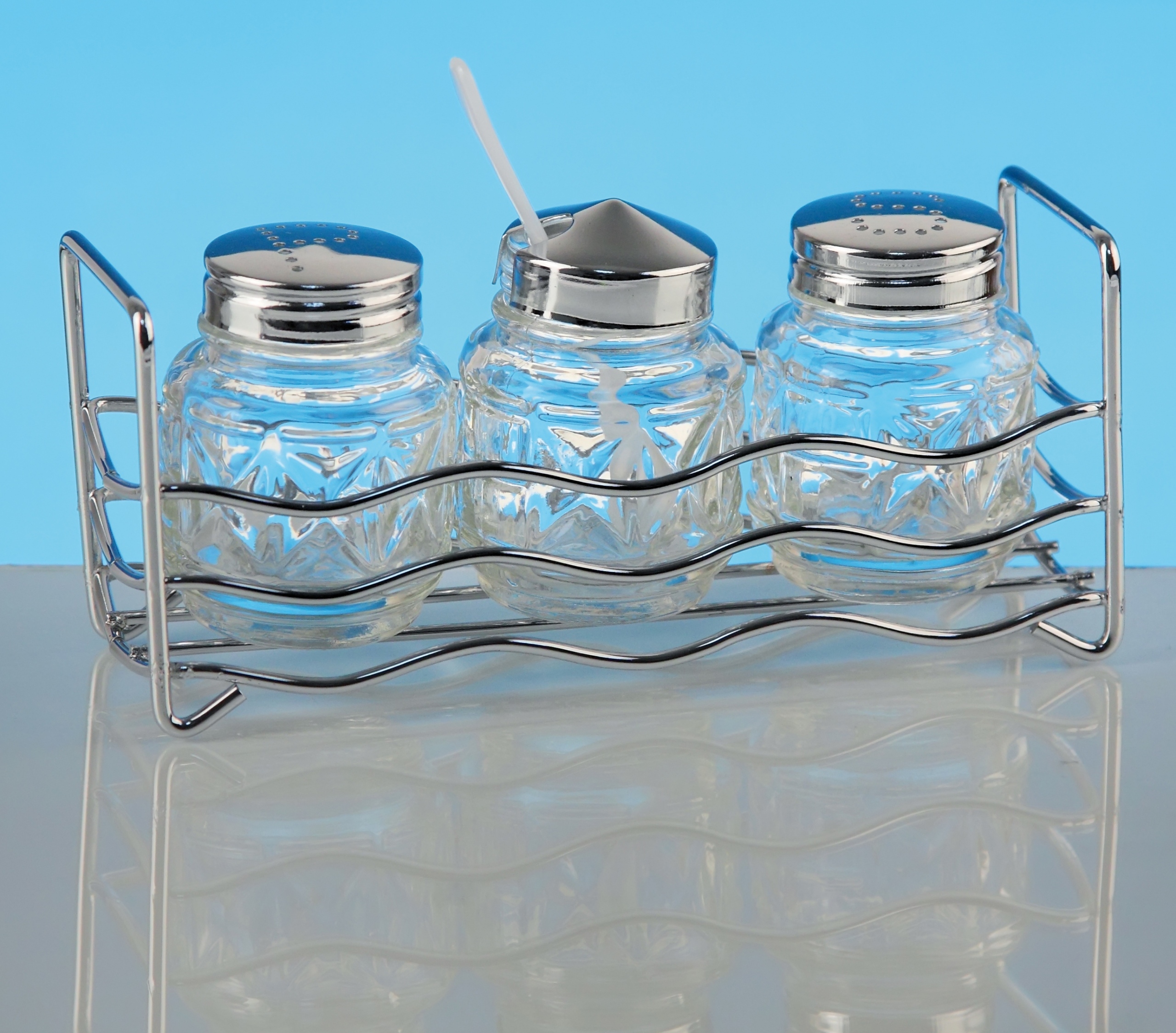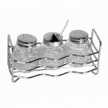 • Универсальный набор для специй 3 предмета является неотделимым атрибутом сервировки и украшением обеденного стола. В комплект входят: две емкости под специи и соль, емкость под сахар с ложечкой. Подставка выполнена из нержавеющей стали, которая не окисляется и не деформируется при долгом сроке использовании.
