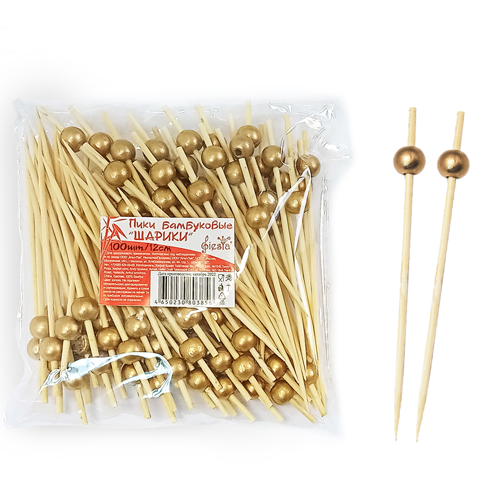 Пика деревянная Шарики 12см (золото) 100шт/уп