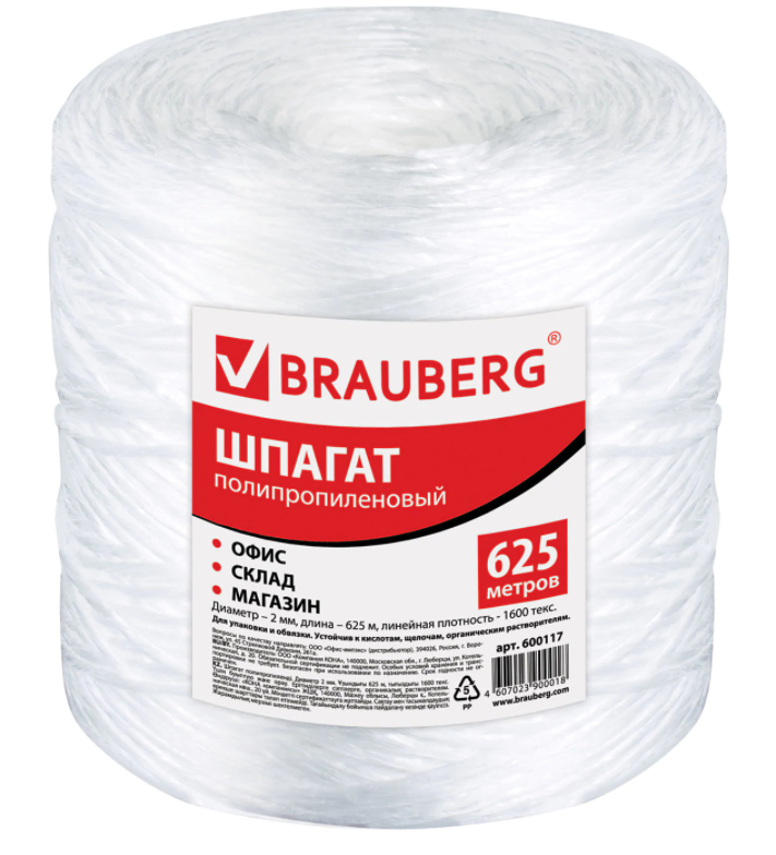 Полипропиленовый шпагат BRAUBERG отлично подходит для хозяйственных и бытовых нужд в домашнем и дачном хозяйстве. Активно применяется в обвязке, упаковке товаров и посылок, подвязки растений и деревьев, плетении, декорировании.