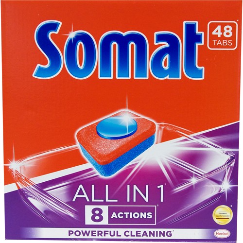 • Средство для мытья посуды в посудомоечных машинах Сомат Всё-в-1 в форме таблеток. (1) Сомат ВСЁ-В-1. (2) 8 действий. (3) Мощное очищение. (4) Таблетки. (5) Джерман Текнолоджи. Откройте для себя чистящую силу таблеток Сомат. Сомат ВСЁ-В-1 без фосфатов, с добавлением соли лимонной кислоты. Забота об окружающей среде и ослепительная чистота посуды без лишних усилий.