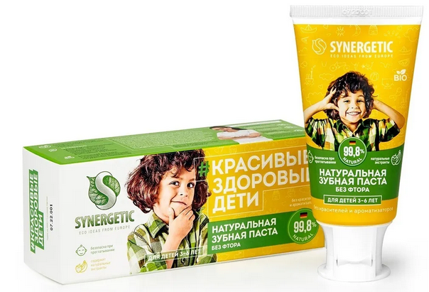 Зубная паста Детская SYNERGETIC (клубничка и банан) желтая 50гр