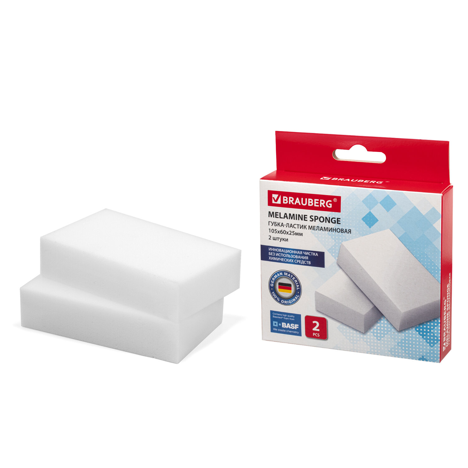 Губка меламиновая для удаления пятен и стойких загрязнений 105х60х25 мм (2 шт)