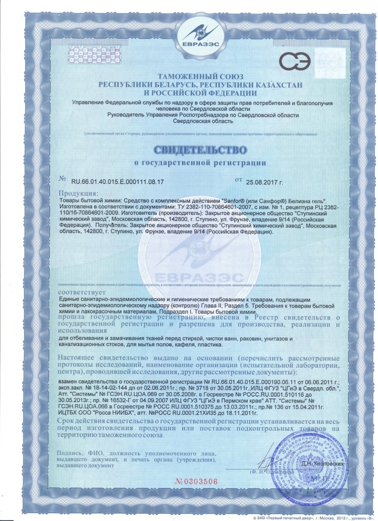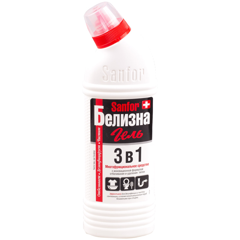 • SANFOR "Белизна" гель 3 в 1 - специальное густое средство с инновационной формулой отбеливания и удаления пятен. Благодаря комплексному действию «3 в 1» - незаменимо при стирке, а также для дезинфекции и чистки сантехники и труб.